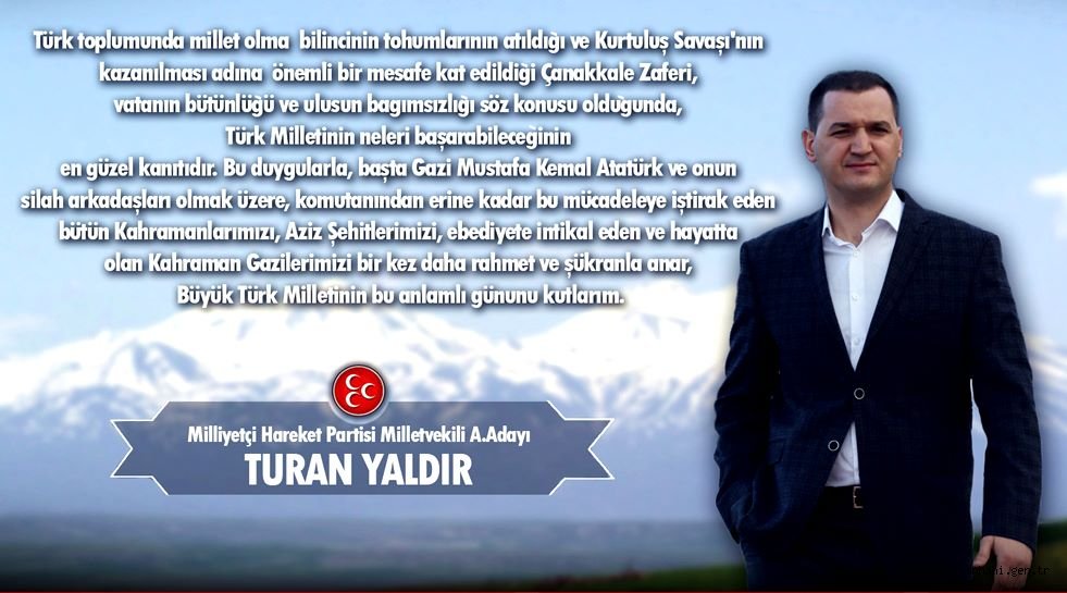 Milliyetci Hareket partisi Aksaray Milletvekili A. Adayi Turan YALDIR seçim çalışmalarına hız kesmeden devam ederken 18 Mart Çannakkale zaferinin 100. yıl dönümü dolayısı ile yayınladığı mesajda " Türk toplumunda millet olma bilincinin tohumlarının atıldığı ve Kurtuluş Savaşı'nın kazanılması adına önemli bir mesafe kat edildiği Çanakkale Zaferi, vatanın bütünlüğü ve ulusun bağımsızlığı söz konusu olduğunda, Türk Milletinin neleri başarabileceğinin en güzel kanıtıdır. Bu duygularla, başta Gazi Mustafa Kemal Atatürk ve onun silah arkadaşları olmak üzere, komutanından erine kadar bu mücadeleye iştirak eden bütün Kahramanlarımızı, Aziz Şehitlerimizi, ebediyete intikal eden ve hayatta olan Kahraman Gazilerimizi bir kez daha rahmet ve şükranla anar, Büyük Türk Milletinin bu anlamlı günunu kutlarım. " dedi.