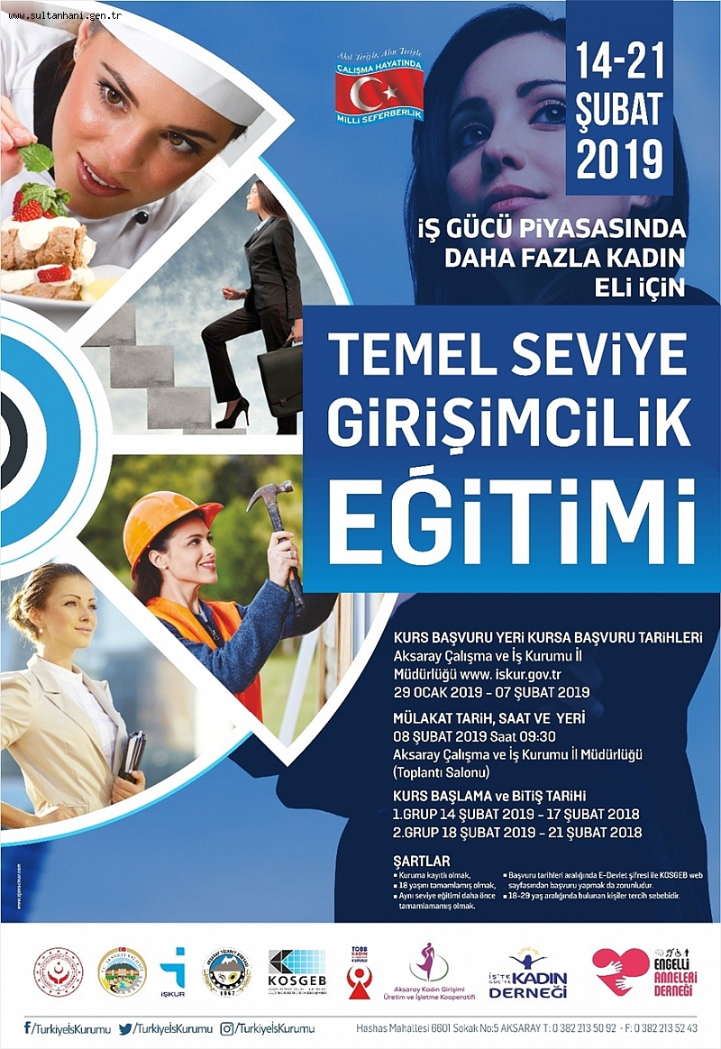 Aksaray Ticaret Borsası, KOSGEB, İŞKUR, Kadın Girişimciler Kurulu, Aksaray Kadın Girişimi Üretim ve İşletme Kooperatifi, İş’te Kadın Güç’te Kadın Derneği ve Aksaray Engelli Anneler Derneği işbirliğinde gerçekleştirilecek olan “Girişimcilik Kursları” devam ediyor. Genç girişimciler tarafından yoğun ilgi gören Uygulamalı Girişimcilik Eğitimleri girişimcilerden gelen talep üzerine ihtiyaç doğrultusunda 50 kişilik girişimcilik kursu açılıyor.Müracaatlar bizzat girişimciler tarafından İŞKUR'da gerçekleşiyor.