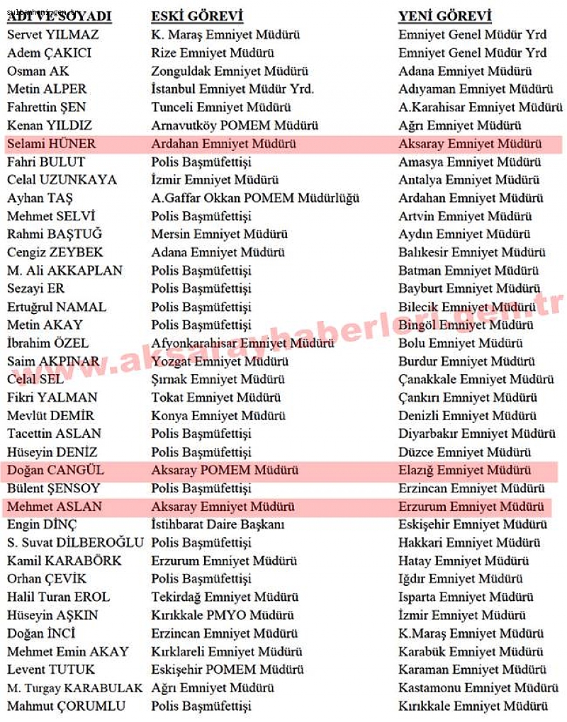 Buna göre Aksaray Emniyet müdürü Mehmet Aslan Erzurum emniyet müdürlüğüne, Ardahan emniyet müdürü Selami Hüner ise Aksaray emniyet müdürülüğüne atandı.