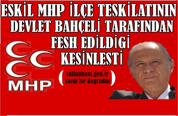 Bugün saat 14 civarında sultanhani.gen.tr sitemizden MHP genel Başkanı Devlet Bahçeli Tarafından Eskil MHP İlçe yönetiminin fesh edilerek görevden alındığı haberini Aksaray'da ilk olarak Son dakika haberi olarak yayınlamıştık , Haberimize ilk etapta Eskil Haberfark sitesine Açıklama yapan Eskil ilçe Başkanı yalanlamıştı Fakat Bizler sultanhani.gen.tr olarak Kesin ve kati olan haberimizin arkasında durduk ve bu akşam itibari ile Eskil MHP İlçe yönetiminin Devlet Bahçeli tarafından Fesh Edilerek Görevden alındıgı Kesinleşmiştir.