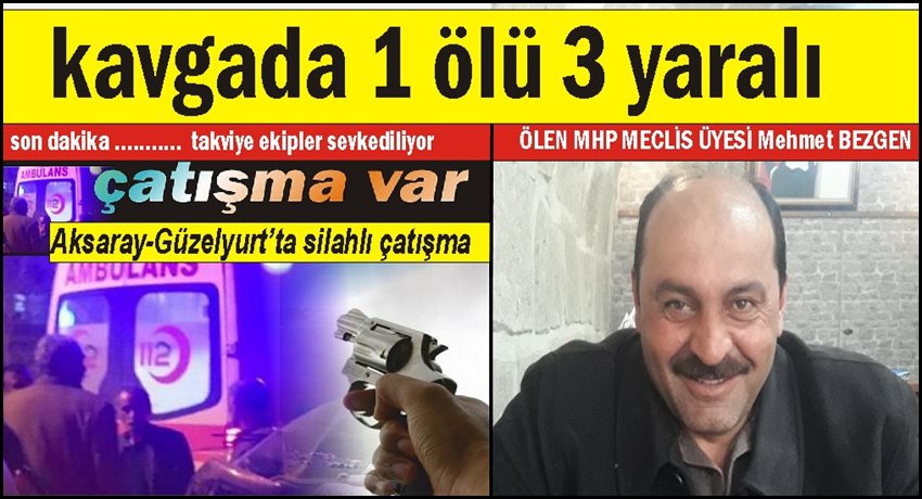 Olay akşam saatlerinde Aksaray ili Güzelyurt ilçesi çarşı meydanındaki parkta meydana geldi.İddialara göre MHP Güzelyurt Belediye Meclis Üyesi Mehmet Bezgen ve yeğeni esnaf Mehmet Bezgen bilinmeyen bir sebepten ismi henüz öğrenilemeyen bir şahısla tartışmaya başladı.Tartışmanın kavgaya dönüşmesiyle MHP Güzelyurt Belediye Meclis Üyesi Mehmet Bezgen ve yeğeni esnaf Mehmet Bezgen silahtan çıkan kurşunların hedefi oldu.Silahtan çıkan merminin başına isabet ettiği MHP Güzelyurt Belediye Meclis Üyesi Mehmet Bezgen Güzelyurt ilçesi Hastanesine kaldırılırken,yeğeni Mehmet Bezgen Aksaray Eğitim ve Araştırma Hastanesine sevk edildi.MHP Güzelyurt Belediye Meclis Üyesi Mehmet Bezgen yapılan tüm müdahalelere rağmen kurtarılamayarak hayatını kaybetti.İlçeye çok sayıda Aksaray´dan takviye polis ekipleri sevk edildi.Olayla ilgili soruşturma devam ediyor.