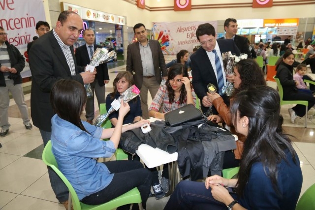 Kültürpark Site AVM’de düzenlenen AKMEK sergisi açılışı sonrası Alış veriş merkezini gezen Başkan Nevzat Palta ve Başkan Adayı Haluk Şahin Yazgı AVM’de bulunan tüm hanımların 8 Mart Dünya Kadınlar Gününü kutlayarak karanfil hediye ettiler.