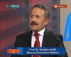 ASÜ Rektörü Prof. Dr. Mustafa Acar, TRT Okul kanalında canlı yayınlanan ‘Rektörler Anlatıyor’ programına konuk oldu. Yaklaşık yarım saat boyunca hem üniversiteyi, hem de Aksaray’ı Türkiye’ye anlatan Rektör Acar, ASÜ’nün Türkiye’nin en dinamik üniversitelerinden bir tanesi olduğunu kaydetti. Son 1 yıl içerisinde kampüste fiziksel alt yapıyı hızla iyileştirdiklerini ifade eden ASÜ Rektörü, bu süre içerisinde açılışı yapılan ve hizmete giren tesisleri sıraladı ve şöyle devam etti: “Türkiye’nin en modern ve görkemli Beden Eğitimi ve Spor Yüksek Okulu (BESYO) binalarından birisini bitirdik ve açılışını yaptık. Bunun yanı sıra Yarı Olimpik Yüzme Havuzu ile Çarşı Sosyal Yaşam Merkezi hizmete girdi. Merkezi Derslikler ve Konferans Salonunu bitirdik. Şu anda bin 280 kişilik Aksaray’ın en görkemli konferans salonuna sahip olarak yolumuza devam ediyoruz. Kısa zaman önce Sayın Diyanet İşleri Başkanımızın da katıldığı bir törenle Kampüs Camimizin açılışını yaptık. Kampüste Mühendislik Fakültemizin ikinci etap binası için çalışmalar devam ediyor. Ayrıca yakında temelini atacağımız Veteriner Fakültesi binamız var. Hem fiziksel alt yapıyı son derece hızlı şekilde bitirelim ve öğrencilerimiz için daha iyi bir kampüs yaratalım diye uğraşıyoruz, bir taraftan da bu binaların içini nitelikli elemanlarla dolduralım istiyoruz.”