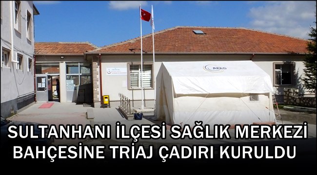 Ülkemizde Koronavirüs (COVİD-19) hastalığının yayılmaya devam etmesi nedeniyle Sağlık Bakanlığı tarafından hastalığın yayılmasına engel olmak amacıyla çeşitli koruma ve kontrol önlemleri alınıyor. Bu önlemler Kapsamında Sultanhanı İlçesi Enteğre Sağlık merkezi Bahçesine Sultanhanı Kaymakamlığı ve Sultanhanı Belediyesi Tarafından AFAD il müdürlüğünden temin edilen Triaj Çadırı kuruldı.